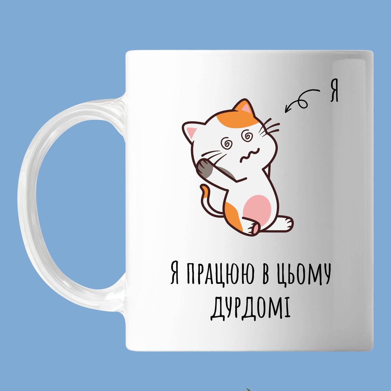 Чашка з написом, для офиса, "я працюю в цьому дурдомі" кіт, кружка з прінтом Орігамі OM 6070